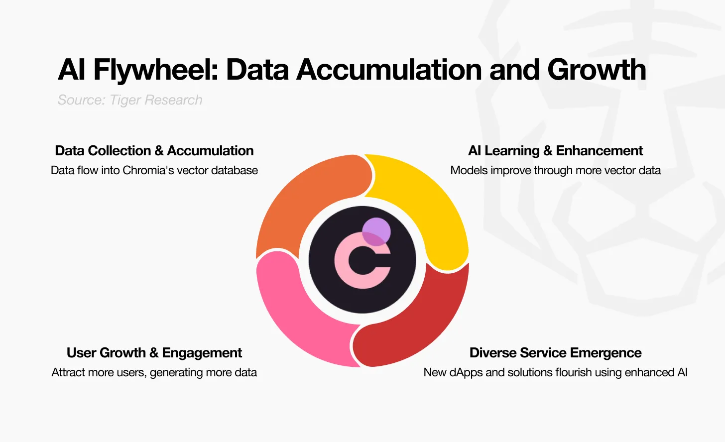 随着多样化用例增长,更多数据持续生成并存储于Chromia——为“AI飞轮”奠定基础。来自区块链应用的文本、图像及交易数据以结构化向量形式存储于Chromia数据库,形成丰富的AI可训练数据集。