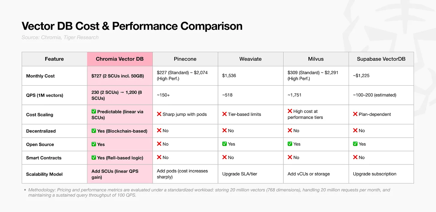Chromia向量数据库进一步强化成本优势。 据内部基准测试,该数据库月运营成本为727美元(基于2个SCU与50GB存储)——比同类Web2向量数据库解决方案低57%。
