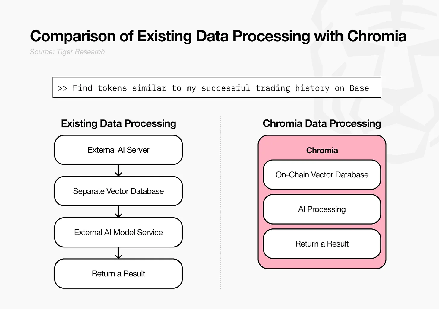 Chromia通过将向量数据库直接集成至区块链,提供了根本性解决方案。在Chromia上,所有处理均在链内完成:用户查询被转化为向量,直接在链内搜索相似数据并返回结果,实现全流程单环境处理。