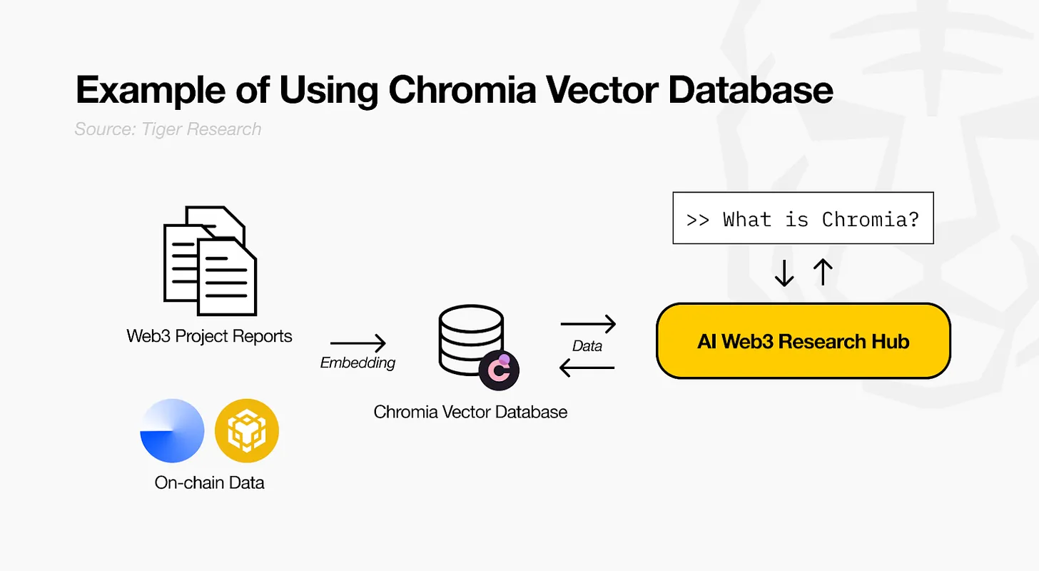 假设案例如Tiger Labs开发的“AI Web3研究枢纽”。该系统利用Chromia基础设施将研究内容与Web3项目链上数据转化为向量嵌入,供AI代理提供智能服务。