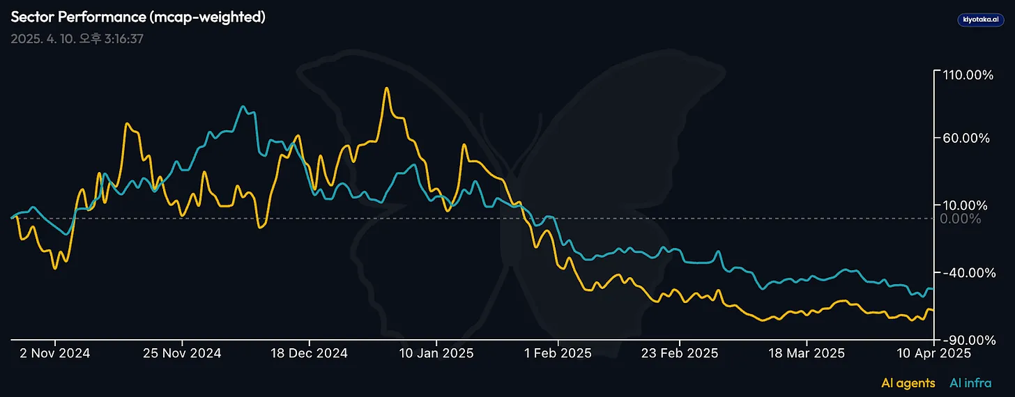 尽管AI代理市场在2024年末爆发,但大多数项目仅实现了两种技术的表面级整合。 许多举措依赖加密货币的投机兴趣获取资金和曝光,而非探索与Web3的深度技术或功能协同。因此,众多项目的估值已从峰值下跌超过90%。