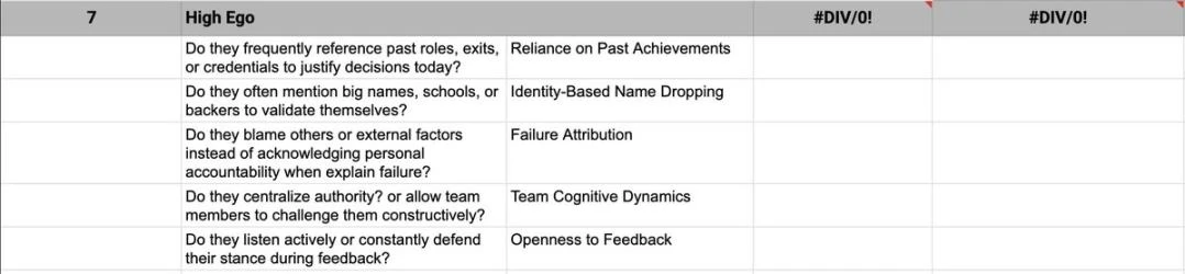 在我们的 Founder Assessment Form 中,我们会刻意观察下面几个维度,以辨别一个创始人是否容易陷入 ego 驱动的决策模式: