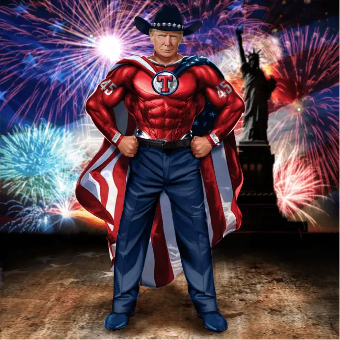 相较之下,特朗普本人在 NFT 项目上的表现更具商业回报。他于2022年12月推出首批“数字交易卡”(Trump Cards),有意淡化“NFT”标签。这组卡牌通过插画形式塑造出理想化形象——肌肉发达、年轻英俊,穿着超人或牛仔服饰,风格夸张、脱离现实。