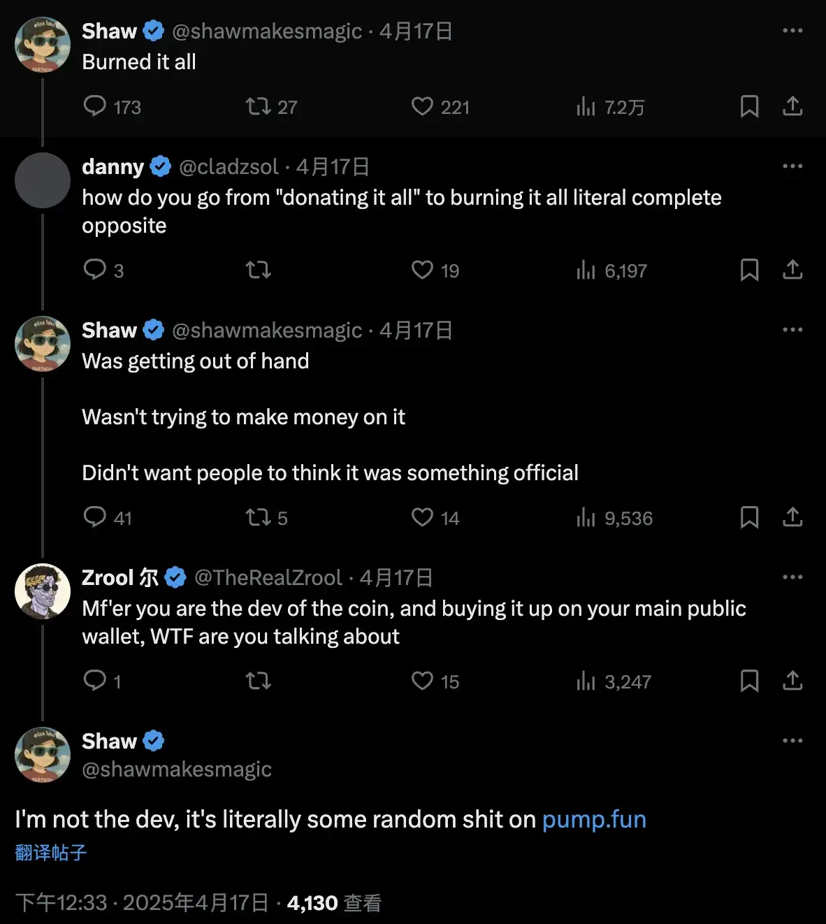 而在网友的谩骂后被怀疑是缺钱开盘割韭菜,Shaw 坚决否认自己是 Dev,而对此的解释是「我在 Pumpfun 上买了几个随机币,它就开始涨了,我说我会捐赠它,但后来有人告诉我这是一个 SCAM,所以我把代币烧掉了,抱歉造成混淆。我只是想玩玩而已。」