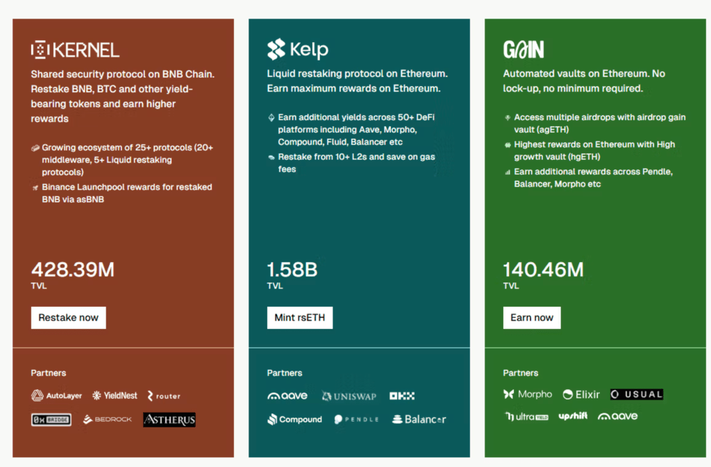 核心三大产品——Kernel、Kelp 和 Gain——实现跨链价值整合:Kernel 保障 BNB Chain 协议安全,Kelp 支持 ETH 流动质押,Gain 聚焦自动收益和空投挖矿策略。