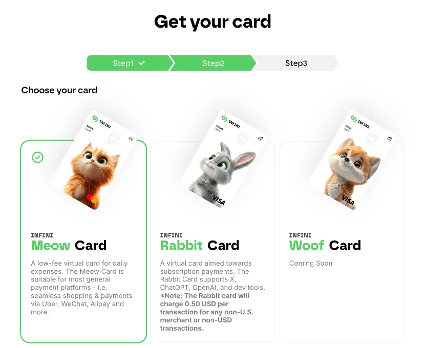 Infini 旗下拥有三种不同的卡片: Meow Card 与 Rabbit Card 是核心虚拟卡产品 ,面向不同用户需求提供灵活的链上支付与日常消费解决方案。目前,两种卡片均以 9.9 美元的定价出售, 不收取年费或月费,支持绑定支付宝与微信支付 ,是少数兼容中国用户主流支付工具的境外虚拟卡产品之一。
