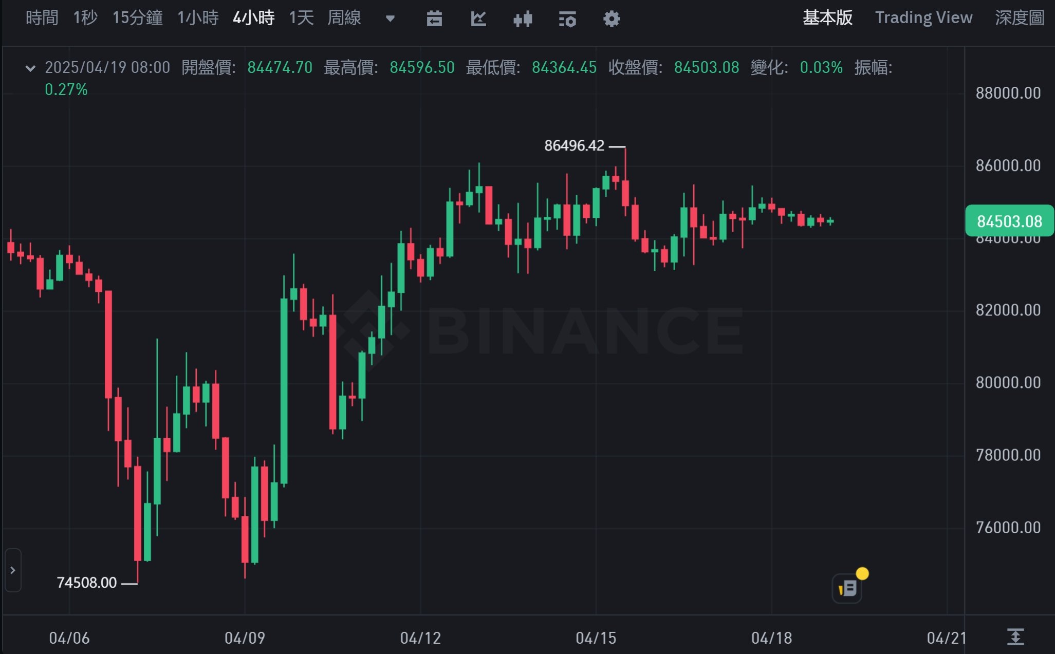 另一方面,美股昨日因复活节休市。比特币价格也未出现明显波动,持续在 8.4 万美元至 8.5 万美元之间小幅震盪,截稿前报 84,503 美元,近 24 小时跌幅 0.3%。