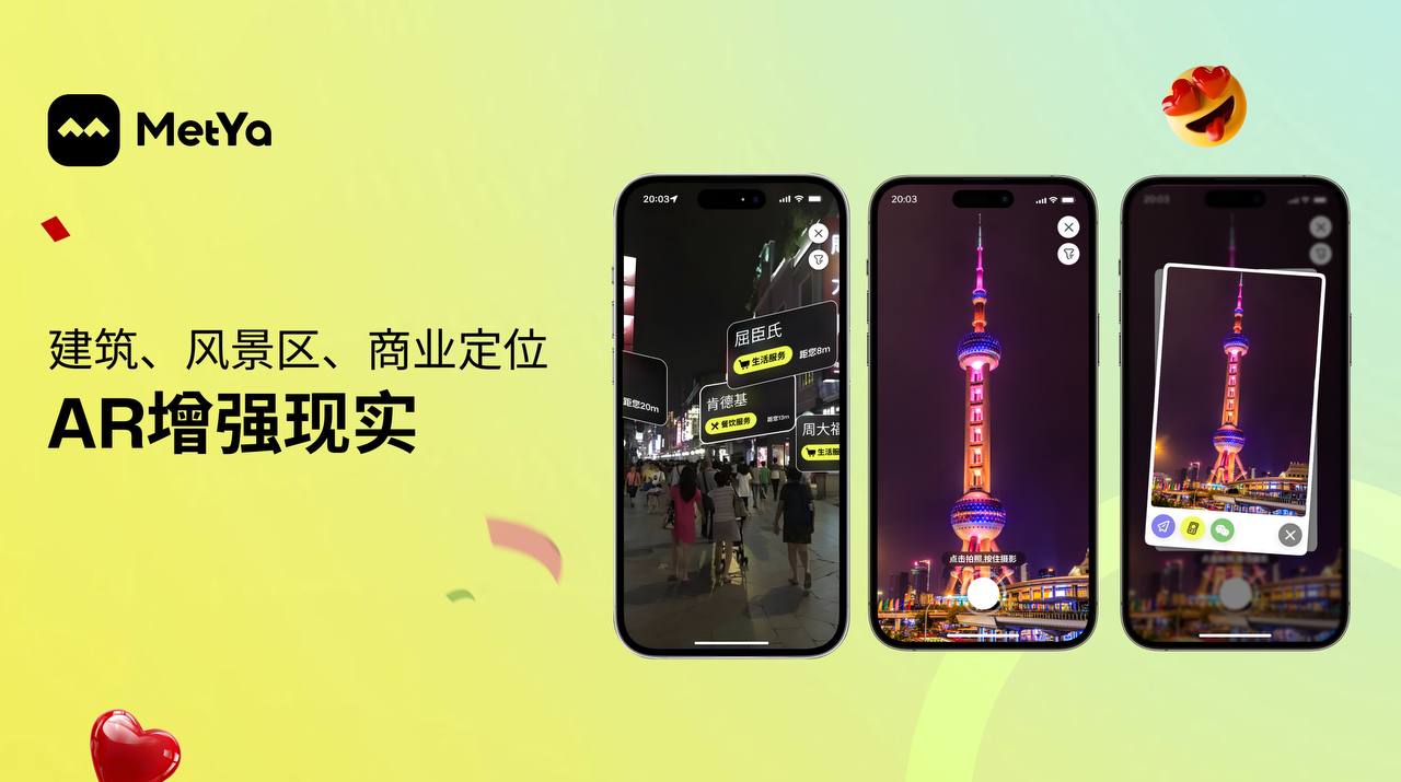 通过增强现实(AR)技术,Metya 的“本地生活”功能进一步增强了线下社交场景的互动性与趣味性。用户可以通过点击 AR 按钮,进入增强现实模式,在城市中发现附近的商家、用户及足迹,并与之互动。每当遇到特定的建筑或景点时,AR 效果自动触发,用户可以通过拍照与场景互动并分享给社交平台,分享自己的社交经历与故事。