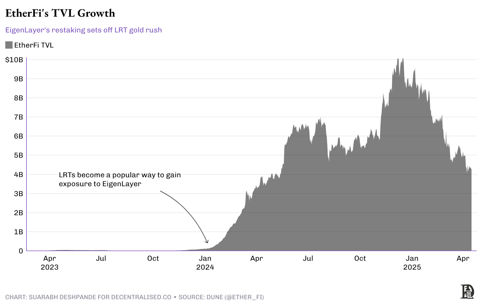 结果如何?令人印象相当深刻。到 2024 年 5 月,Ether.fi 的 TVL 飙升至约 60 亿美元。他们的“Liquid Vault”提供大约 10% 的年利率,而当时普通的质押还不那么令人兴奋。