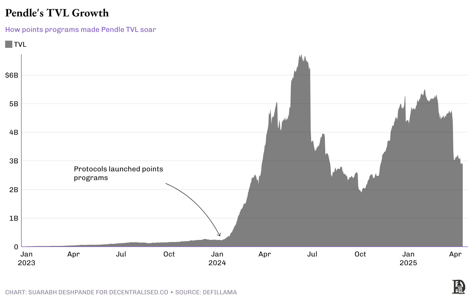 Pendle 创始人 TN Lee 曾在播客中对此进行了详细分析。该团队并没有为积分构建元架构。他们无法预测到这一点。但他们为这种新兴行为构建了完美的基础设施,并获得了丰厚的资本。即使这种趋势最终降温,TVL 降至约 25 亿美元,他们的市值仍然比积分出现之前高出 10-15 倍。