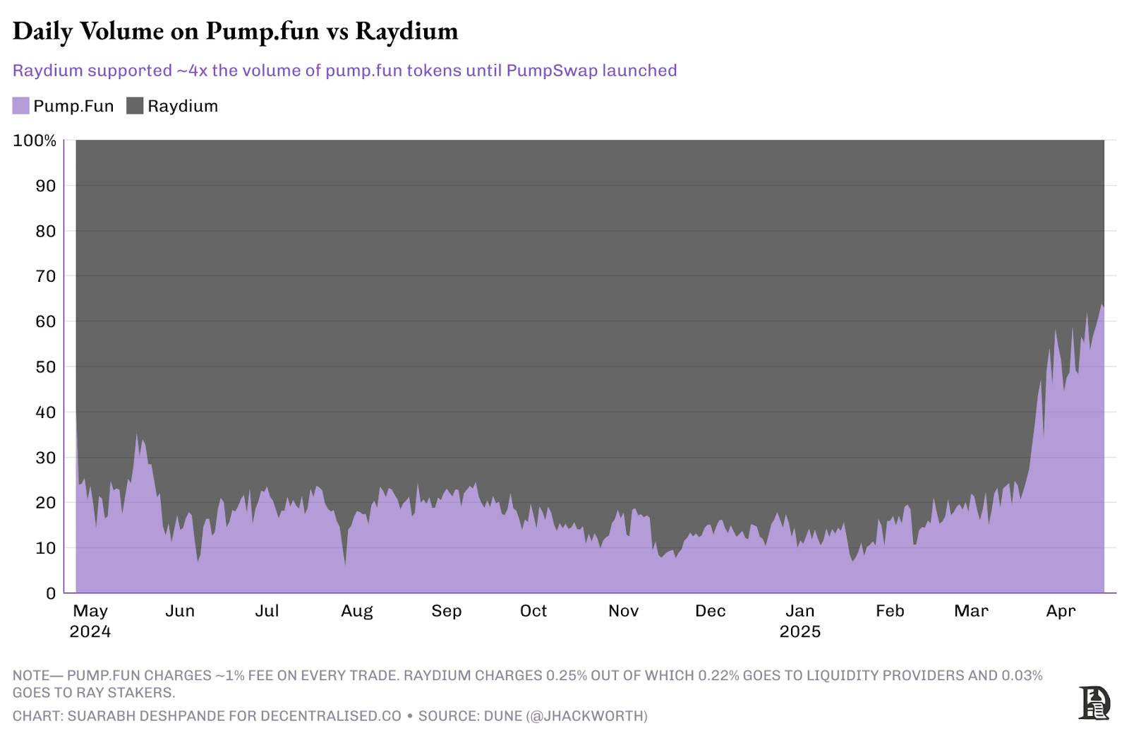 PumpFun 团队的经济效益也令人叹服:在 PumpFun 平台上独家交易的代币每笔交易收取 1% 的手续费,而 Raydium 的手续费结构为 0.25%。这意味着 Raydium 需要创造四倍的交易量才能与 PumpFun 的每笔代币收入持平。由于其更深的流动性和更广泛的用户群,Raydium 在 2024 年 8 月至 2025 年 2 月期间始终成功超越这一门槛。