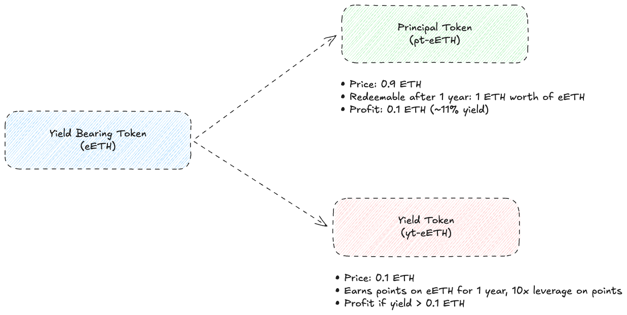 例如,假设 eETH 的价格为 2000 美元,每天可获得 24 个 EigenLayer 积分。 pteETH 代表固定收益代币,yteETH 代表浮动收益代币,售价 200 美元。pteETH 持有者放弃积分,换取固定收益。yteETH 持有者则获得浮动收益和积分。现在,只需 2000 美元,Sid 每天即可获得 240 个(价值 10 ETH)积分,而不是仅仅 24 个。