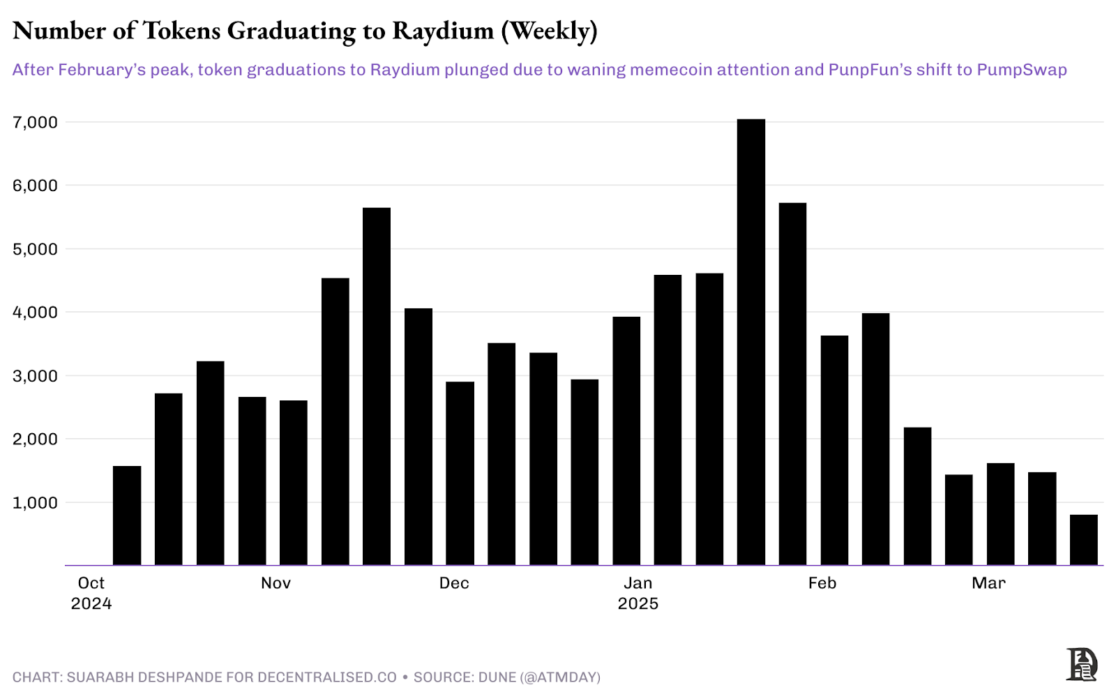 于 Raydium 上市成为这些新兴代币的重要里程碑,在日益拥挤的市场中提升了可信度和知名度。到 2025 年初,这种共生关系变得至关重要,Raydium 超过 40% 的 Swap 收入来自 PumpFun 生成的代币。