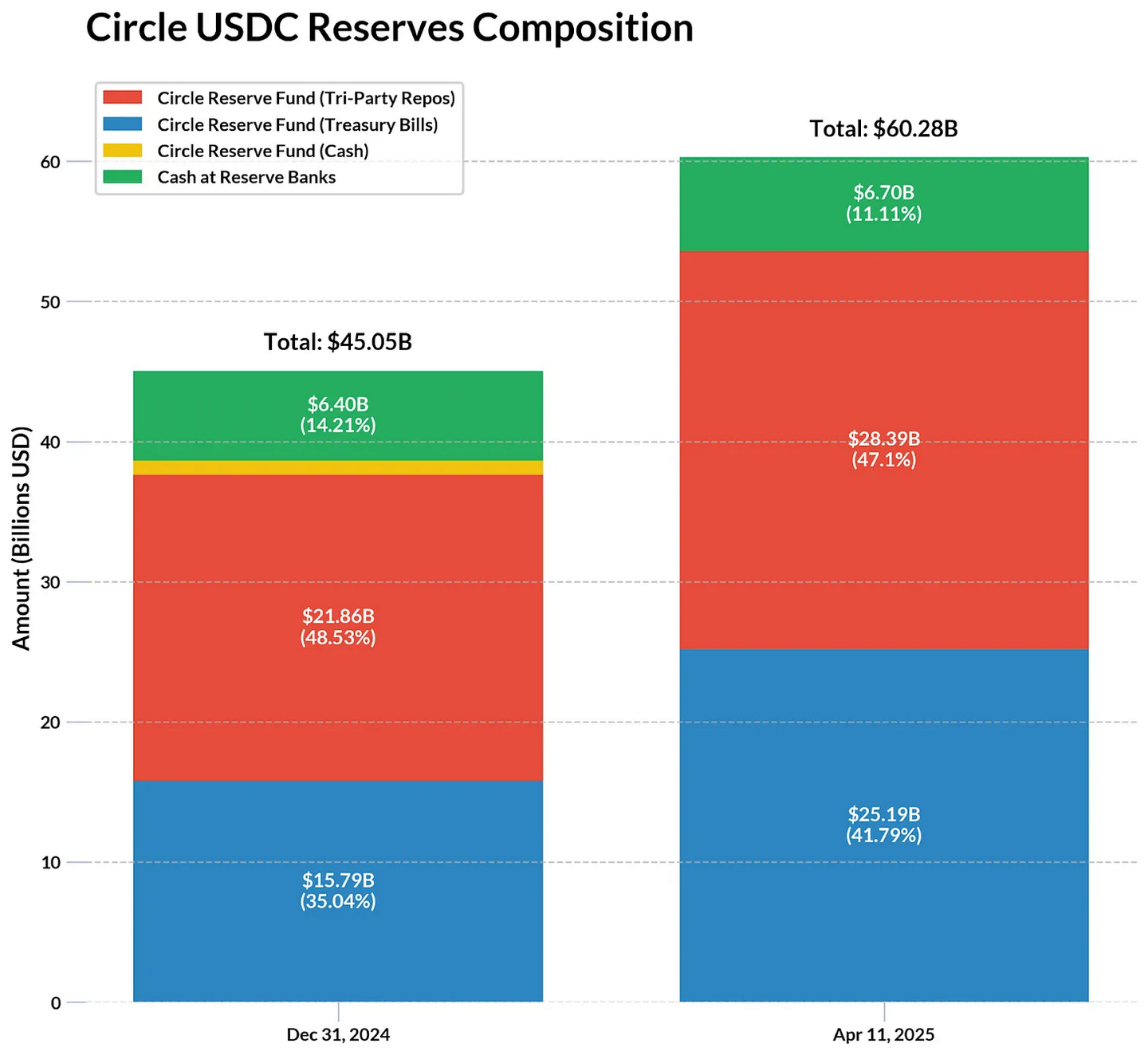 USDC 储备主要持有在 Circle 储备基金中,这是一个由 BlackRock 管理的 SEC 注册政府货币市场基金。根据 Circle 的月度证明、财务报表和 BlackRock Circle 储备基金,截至 4 月 11 日,535 亿美元(约 88%)的 USDC 储备由美国国债和与多家金融机构的隔夜回购协议组成,期限均小于 2 个月。此外,11% 的储备为存放在受监管银行的现金。