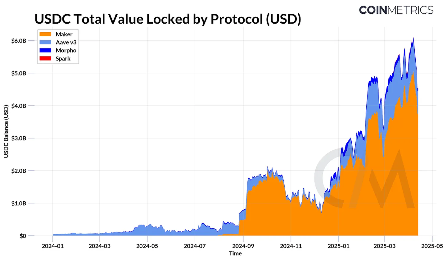 USDC 在 DeFi 借代市场中继续发挥基础作用,Aave、Spark 和 Morpho 等协议锁定了超过 50 亿美元(代表未被借出的 USDC 供应部分)。对于 Maker(现为 Sky)等抵押债务协议,约 40 亿美元的 USDC 通过其 peg 稳定模块支持 Dai/USDS 的发行。