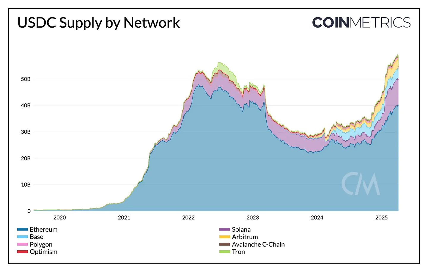 USDC 的总供应量已增长至约 600 亿美元,稳居仅次于 Tether 的 USDT 的第二大稳定币。尽管 2023 年市场份额承压,但已回升至 26%,反映了市场信心的恢复。其中,约 400 亿美元(65%)在以太坊上发行,95 亿美元在 Solana 上(15%),37.5 亿美元在 Base Layer-2 上(6%),其余分布在 Arbitrum、Optimism、Polygon、Avalanche 等链上。