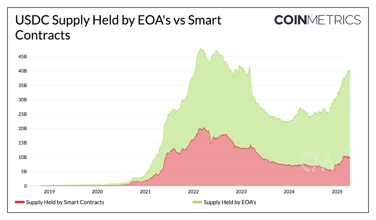 通过区分以太坊上持有在智能合约与外部拥有账户(EOA)的 USDC 供应,可以了解 USDC 在用户钱包和应用中的分布情况。目前,约 300 亿美元由 EOA 持有,同比增长 66%,而约 100 亿美元在智能合约中,同比增长约 42%。EOA 余额的增长可能反映了交易平台托管和个人用户持有的增加,而智能合约的增长表明 USDC 在 DeFi 借代市场中作为抵押品以及去中心化交易平台(DEX)流动性的重要性。