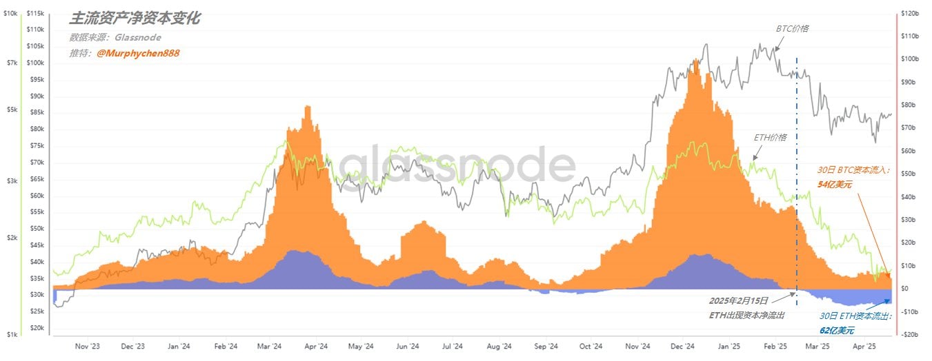 随著情绪消退趋势走弱,自去年 12 月以来, BTC 和 ETH 这两大主流资产的资本流入明显减少,但即便如此,BTC 仍可维持 30 日有 54 亿美元的正向流入;而 ETH 从 2 月 15 日已转为资本净流出,截止到昨天, 30 日流出 62 亿美元。