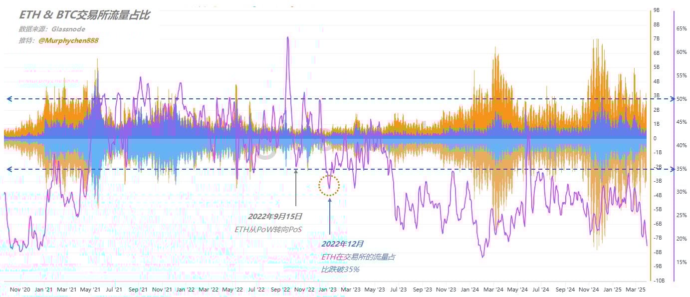 Murphy 指出,从 2022 年 12 月末𫔭始,ETH 在交易所的流量占比跌破 35%,这一数值在 21 年 9 月曾经达到 50%以上,表示在交易所的流入 / 流出占比中, ETH 可以和 BTC 分庭抗礼,但如今占比大幅下降,意味著资金对 ETH 的关注度越来越低。