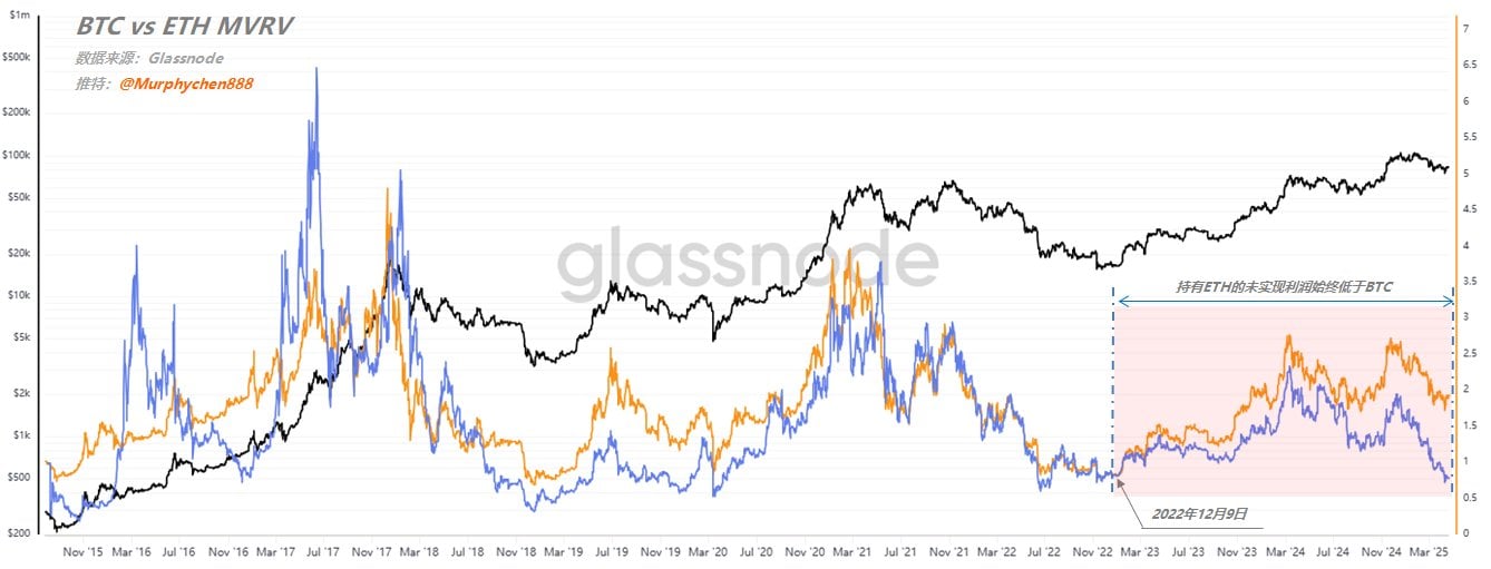 现在蓝缐始终处于黄缐之下,意味著从 22 年 12 月以后直到今天,ETH 持有者的未实现利润始终都低于 BTC。