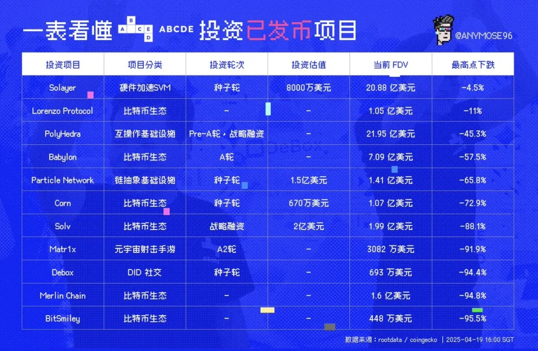 当然,这是并非某个机构或者某个用户能够决定的系统机制,本轮周期包括 ETH 在内的主流币以及山寨币均呈现不同程度的下跌,ABCDE 投资的项目也概莫能外。据加密 KOL @Anymose 96 统计,ABCDE 投资已发币项目中,币价最高下跌幅度高达 95.5% 。