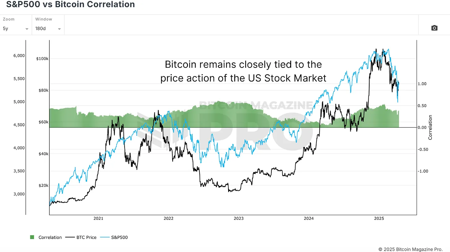 尽管链上数据令人鼓舞,但宏观不利因素仍然存在。对标普500指数与比特币相关性图表的分析表明,比特币仍与美国股票市场保持高度关联。随着对潜在全球衰退的担忧加剧,传统市场的持续疲软可能会影响比特币在短期内反弹的能力。