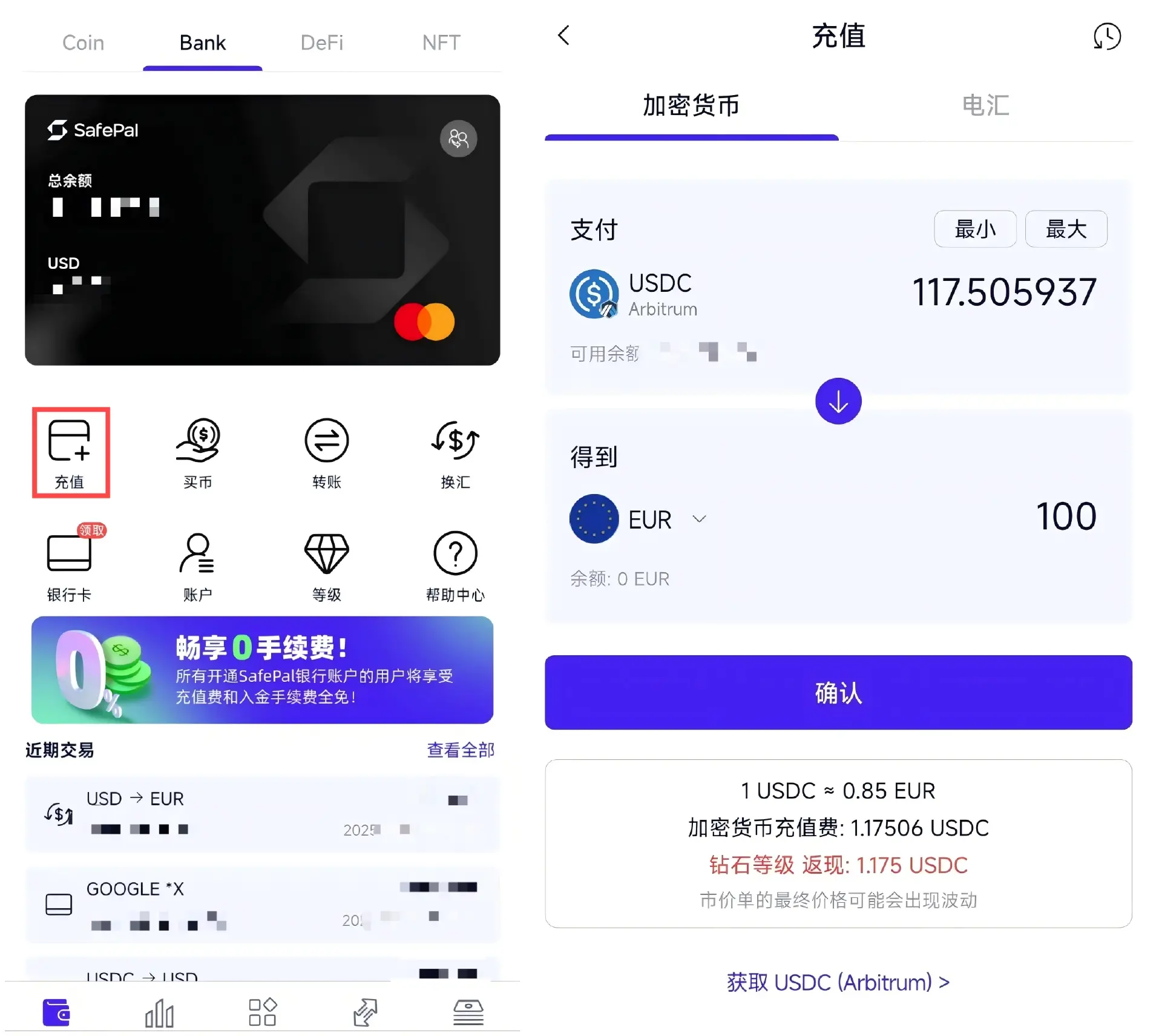 用户可以在 SafePal 钱包 App 的「Bank」页面中,选择「充值」服务,将链上的 USDC(Arbitrum)充值为 EUR,系统会根据实时汇率把 USDC 自动兑换为欧元。