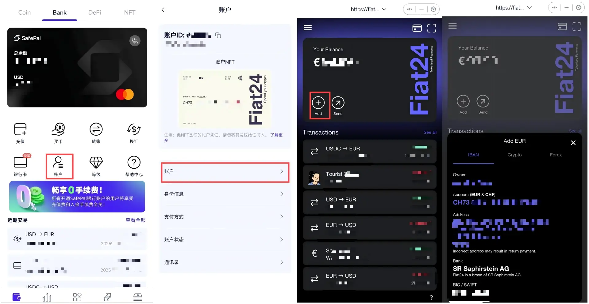 说白了, 绝大部分用户需要的不只是一张可以直接消费加密货币的外币预付卡,而是一套完整、合规的金融账户体系 。年初,笔者就深入体验了 SafePal 与瑞士 Fiat24 银行合作推出的银行通道服务。