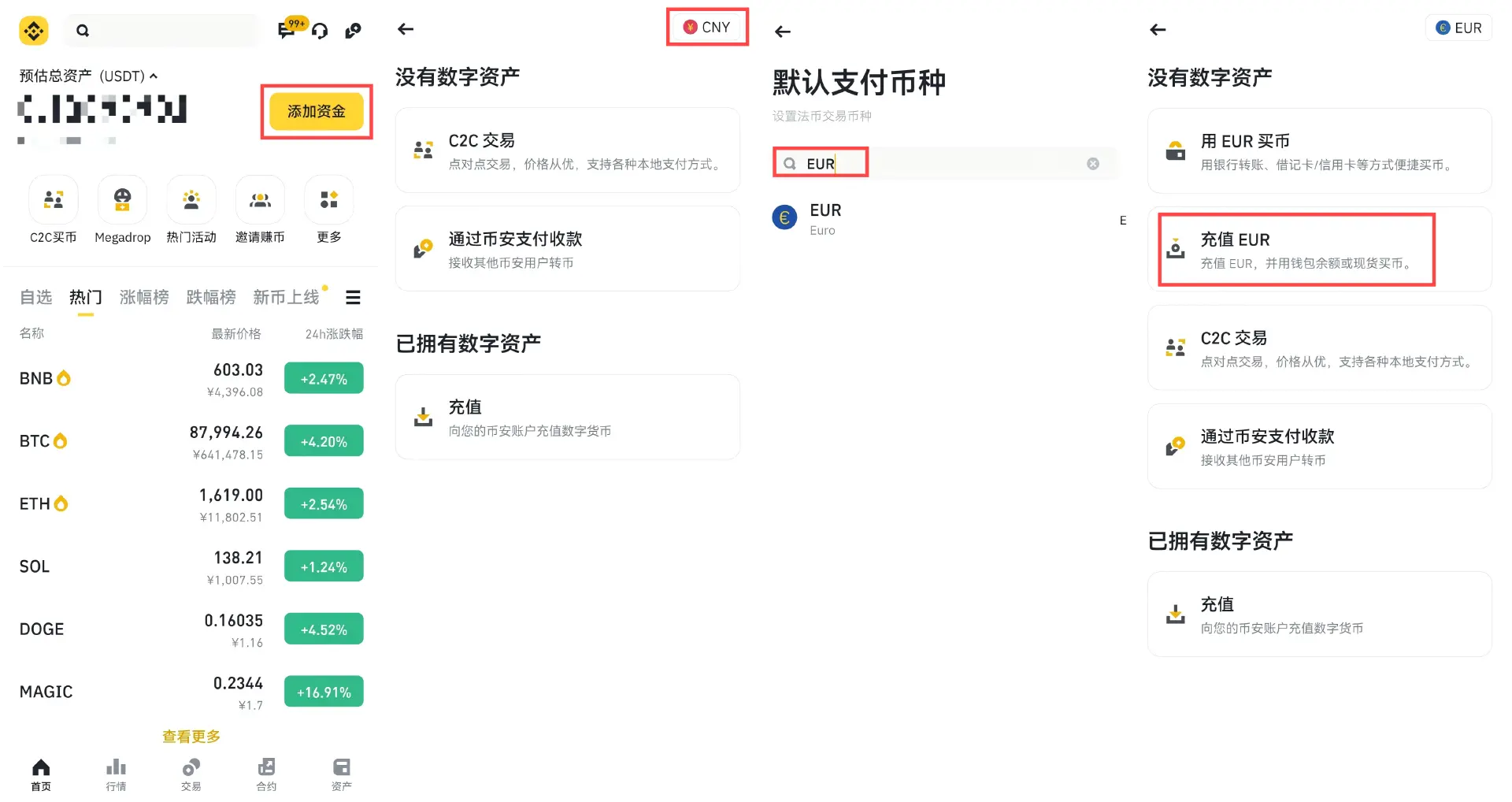 (1)从首页「添加资金」进入,先将右上角的币种,从「CNY」切换为「EUR」,随后点击「充值 EUR」进去。