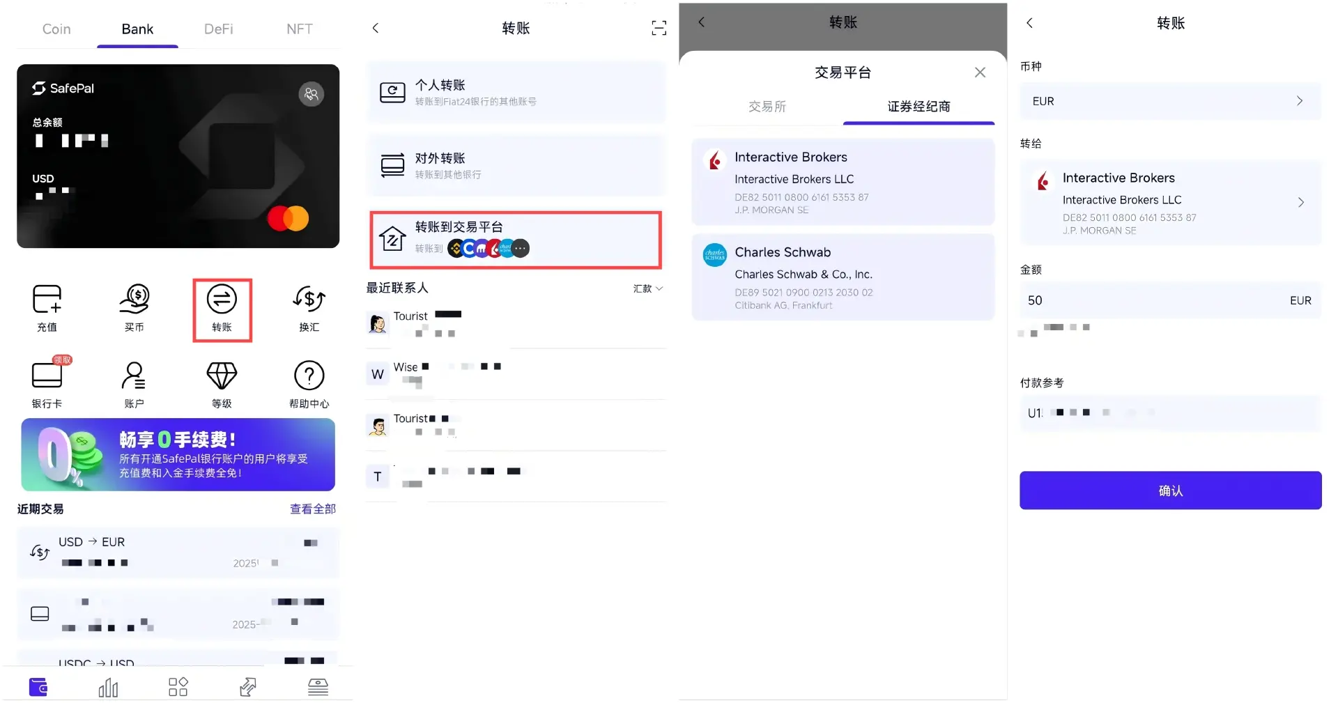 由于 SafePal 提供的个人瑞士银行账户支持欧元转账汇款,因此用户可以将欧元资金直接汇入支持欧元 SEPA 入金的海外券商账户,如盈透证券(IBKR)、嘉信理财(Charles Schwab)等,为跨境投资需求提供了一个更便捷的资金出入通道。