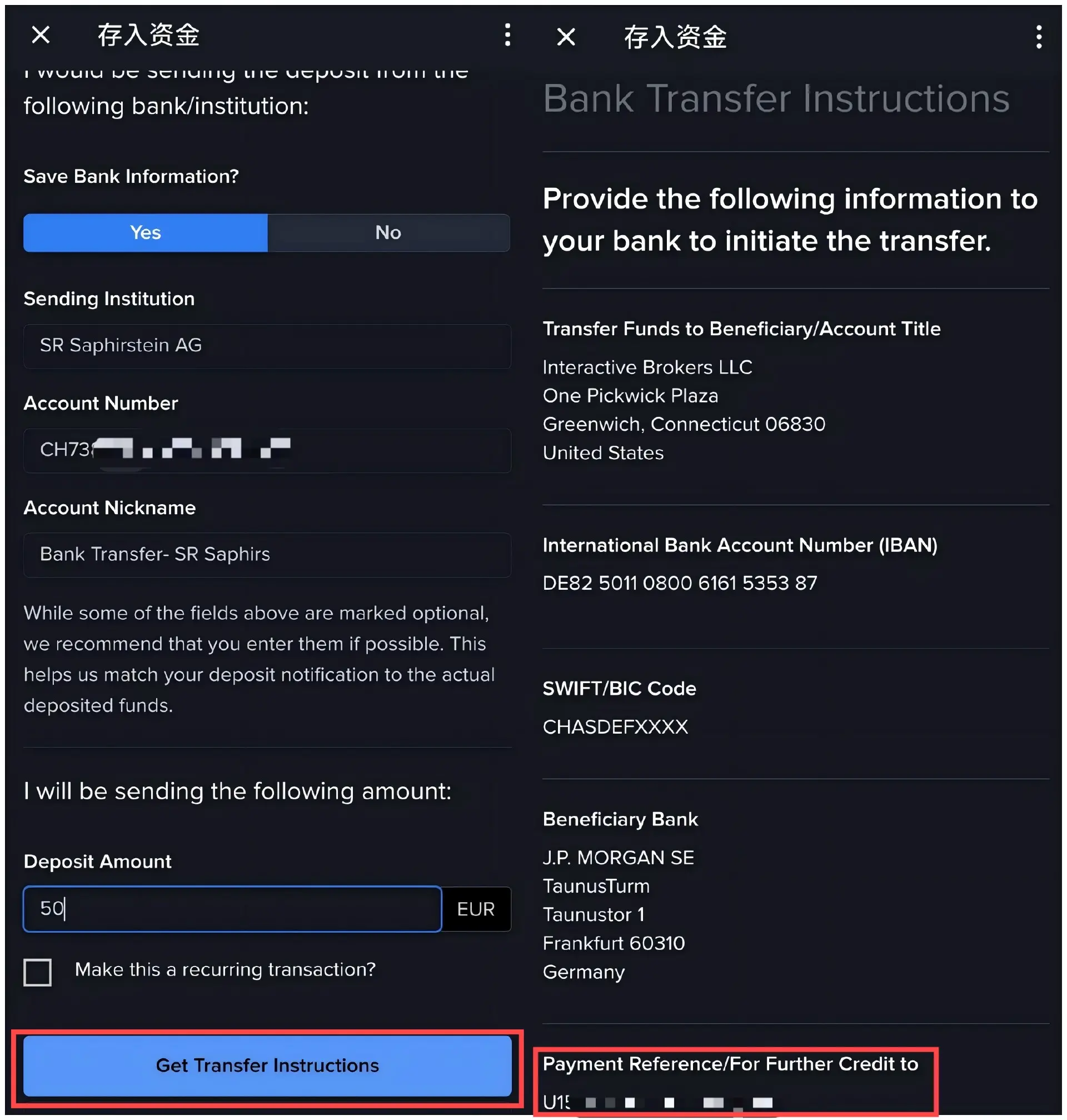 注意,填完以上 4 项后,无需勾选下方的「Make this a recurring transaction」(使其成为定期转账),直接点击「Get Transfer Instructions」获取转账指令。