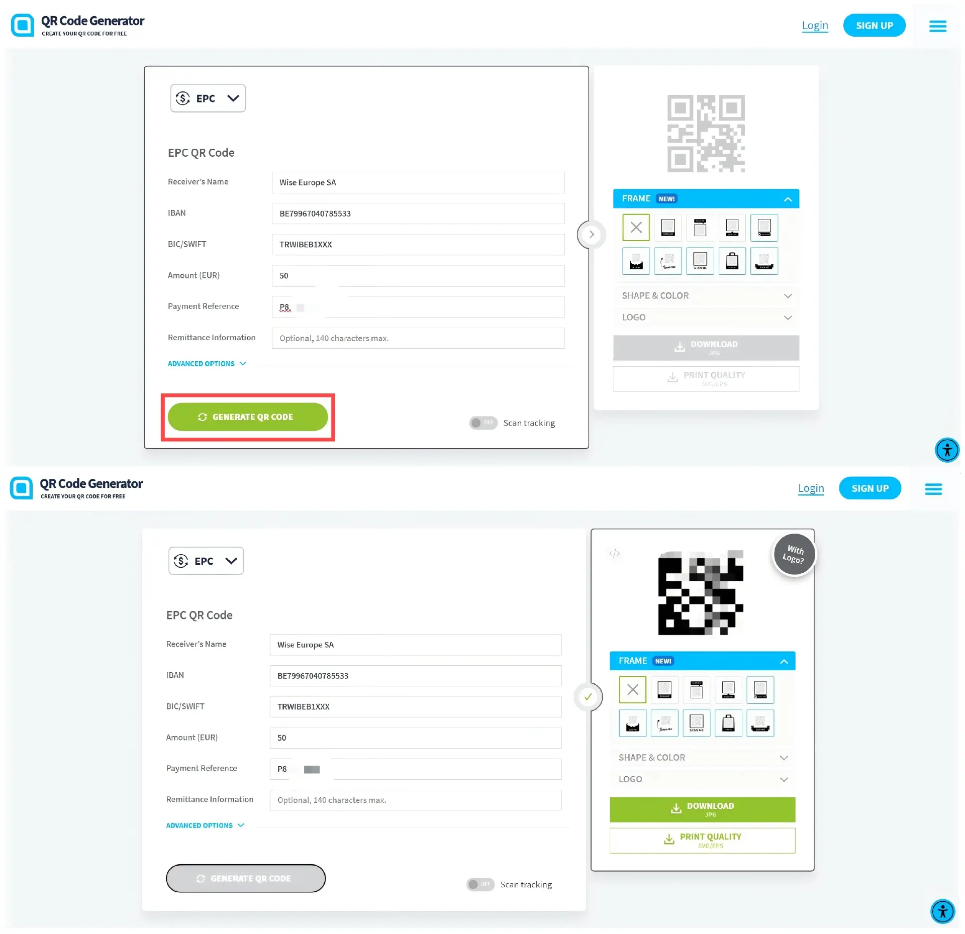 随后点击左下方的「GENERATE QR CODE」,生成转账二维码。