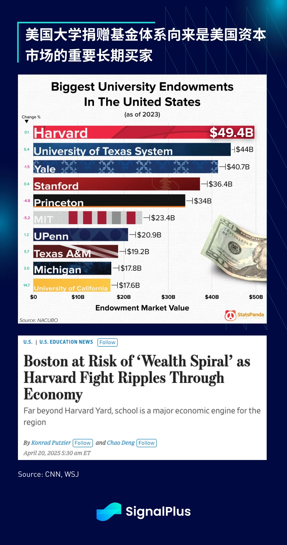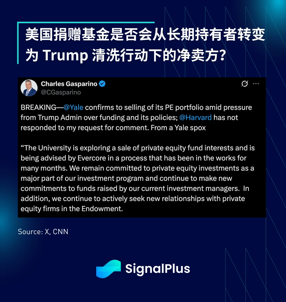 除了在国际上发出威胁之外,Trump 政府近期也在国内与美国捐赠基金展开角力,其中以哈佛为代表,这可能会对市场流动性产生负面影响。