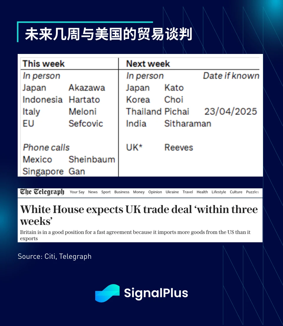 不过,继中国国家主席习近平访问东南亚后,美国也预计将于本周与日本、南韩、泰国与印度在 IMF 春季会议期间进行双边贸易会谈。据报导,英国亦有望于三周内与美国敲定协议。密切关注这几周是否能出现任何具体进展。
