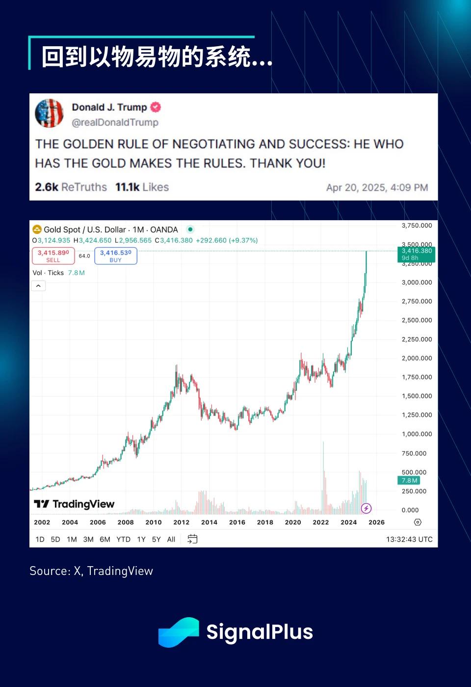 讽刺的是,Trump 总统近日在社群媒体上发表了一则寓意深长的评论:「拥有黄金的人,才能制定规则」,可能指的是他的谈判策略,进一步将黄金现货价格推高至 3, 400 以上的新高。