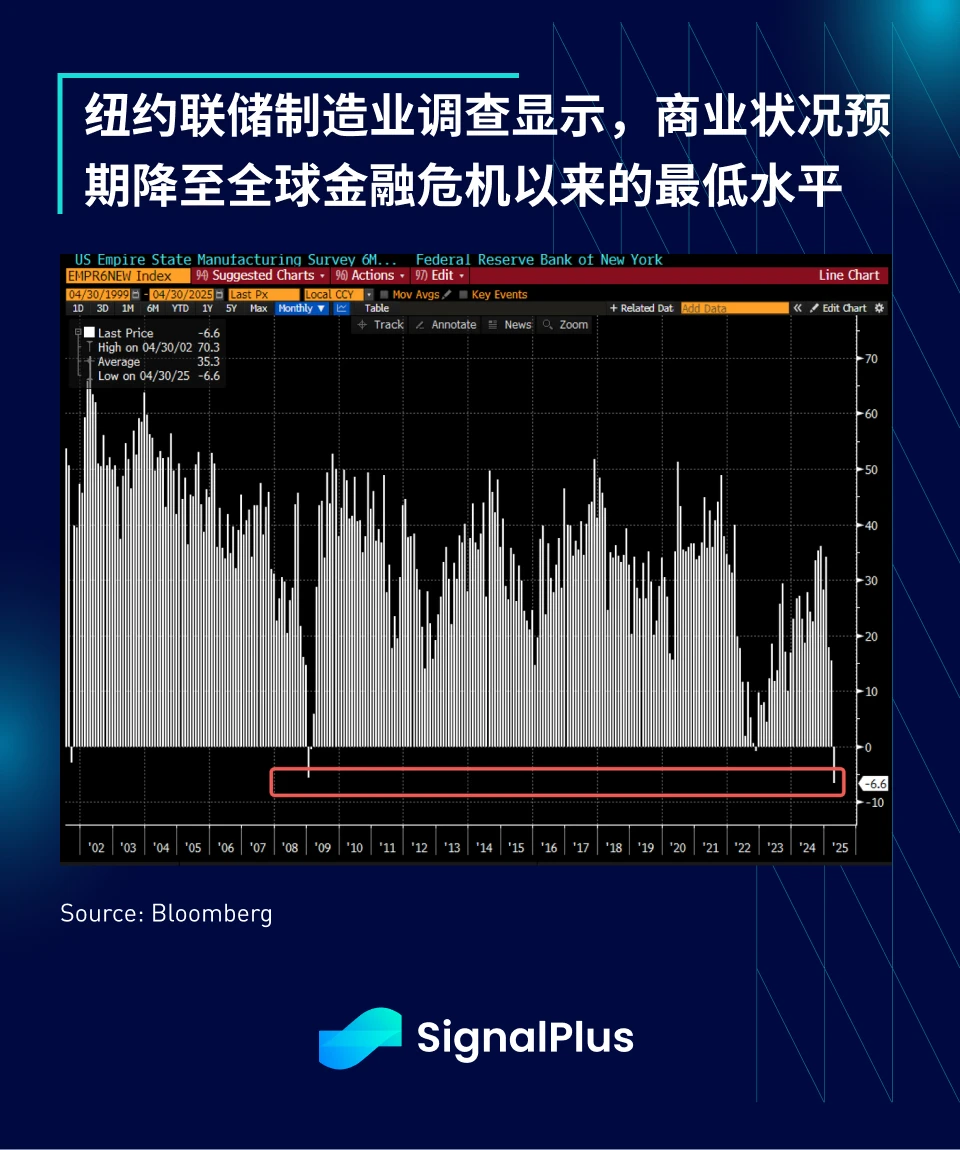 从某些指标来看,当前经济政策的不确定性已经达到有史以来的最高水平,甚至超过了疫情初期。这种不确定性导致企业前景大幅下滑,纽约联储制造业调查显示,商业活动预期已降至十多年来的最低水平。