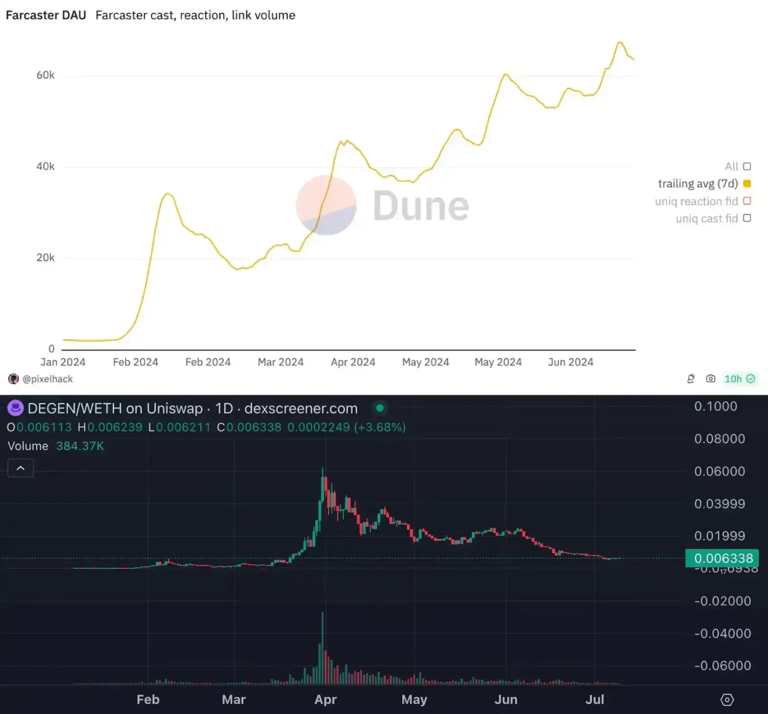 2024 年 2 月,社交代币 $DEGEN 在 Warpcast 中名为 Degen 的频道中走红,成为 Farcaster 破圈的主要推动力。彼时 Farcaster 放开网络注册才仅四个月,每日活跃用户突破 3 万人。随着 $DEGEN 代币发酵、以及出现诸如 Higher 等同类受欢迎的频道代币,Farcaster 的日活最高触及 7 万人。