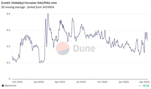 但从用户粘性来看,Farcaster 迄今未能走出冷启动平台的典型困境。根据 Dune 数据,自 2023 年下半年开放注册以来,其 DAU/MAU 比例长期徘徊在 0.2 左右,仅在 2024 年初因 DEGEN 爆火出圈短暂触及 0.4,随后迅速回落。