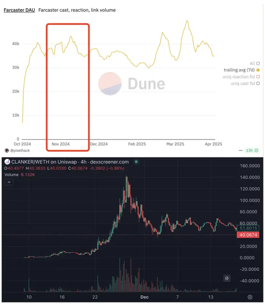Clanker 是 Warpcast 上的一个代币发行 AI Agent,用户发帖并艾特 Clanker 就可以在 Uniswap 发布可交易代币,其官方代币 $CLANKER 在去年 11 月暴涨 20 倍,使 Base 以及 Warpcast 成为同 Solana 在 AI 概念赛道的竞争者。也因为 $CLANKER 的造富效应,Farcaster 的日活用户突破去年夏季以来的新高。