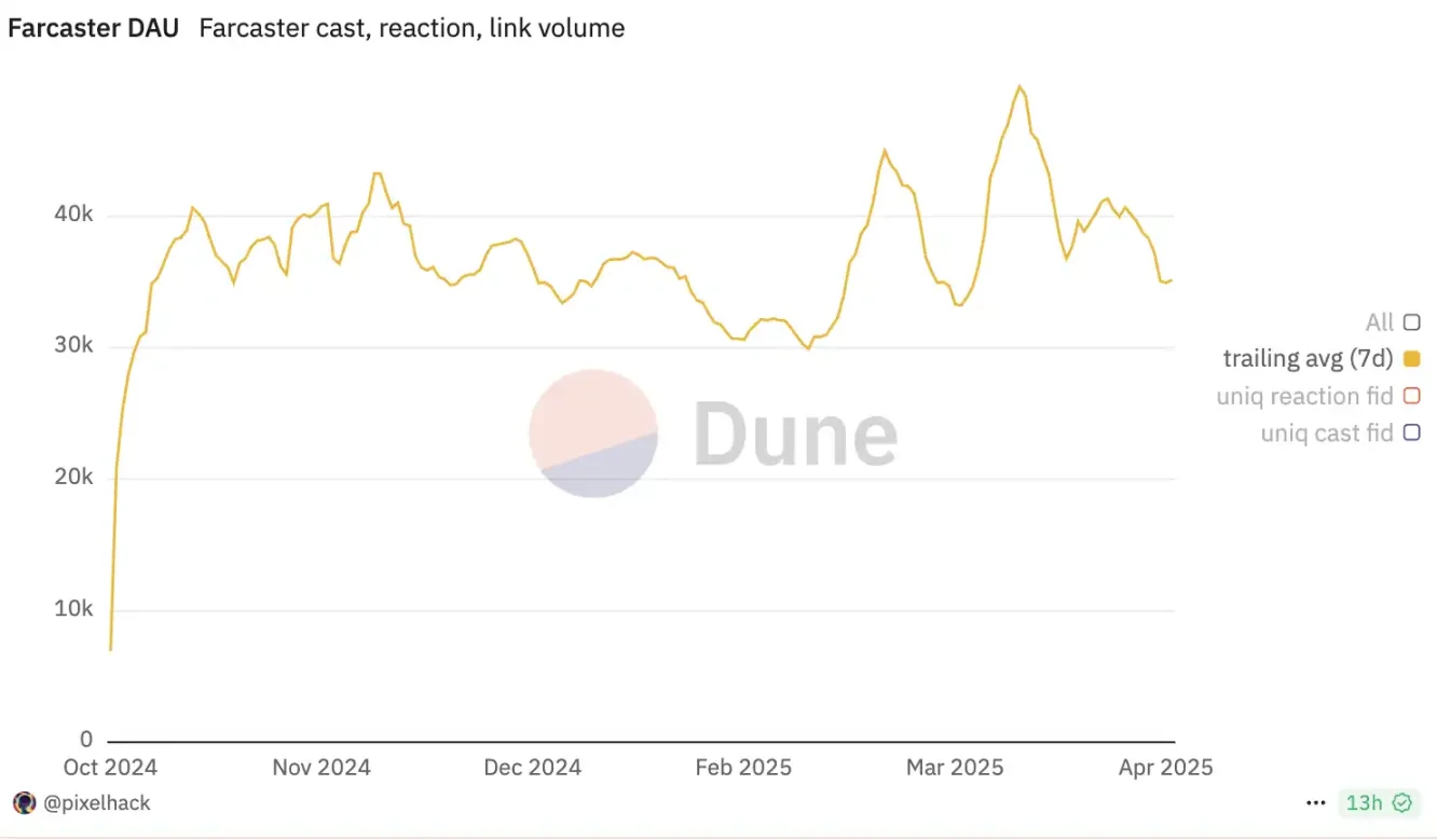 2025 年 3 月,Scalar Capital 及 Bountycaster 联合创始人 Linda Xie 加入 Farcaster 团队,负责开发者关系,重点推进 Frame 的开发与推广。与此同时,Farcaster 推出「空投计划」,鼓励开发者借助 Frame v2 构建应用并通过资产空投触达用户。这一机制虽非官方代币空投,但有效激活了用户增长。3 月中旬,Farcaster 日活跃用户短暂突破 4 万,创下阶段性高点。