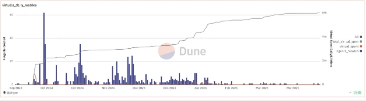 Virtuals 在 2024 年 10 月迎来了代理创建高峰,单日新增代理超过 60 个,随后在 11 月和 12 月掀起了一波实验热潮。但到 2025 年初,每日代理创建数量已降至个位数。