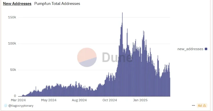 Pump.fun 就像一座火山。2024 年末,在其平台创造了数百万个 Meme 币,高峰期新增钱包超过 15 万个。但此后,趋势便急剧下降,但它并没有消亡。目前在 Pump.fun 平台每日稳定诞生 5 万到 6 万个 Meme 的水平,只是它已不再处于聚光灯下了。