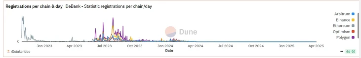 DeBank 在 2023 年中经历了多链注册量的激增,随后便进入了停滞状态。到 2024 年初,新用户已经停止涌入。产品本身并没有缺陷,只是市场格局变化了。DeFi 社交听起来不错,但人们并没有为此留下来。也许他们只是用 DeBank 跟踪了几个钱包而已,然后就离开了。