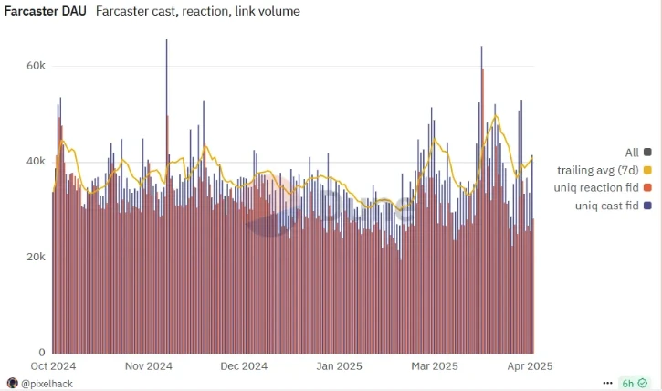 Farcaster 是静默复利 (quiet complication) 的典范。自 2024 年末以来, 其日活跃用户 (DAU) 一直稳定在 2 万到 5 万之间,用户参与度也始终如一,没有出现大幅飙升,也没有空投诱饵,只有真实的使用量。虽然大多数社交协议都在追逐流量,但 Farcaster 却正在养成习惯,这可能才是真正的优势。