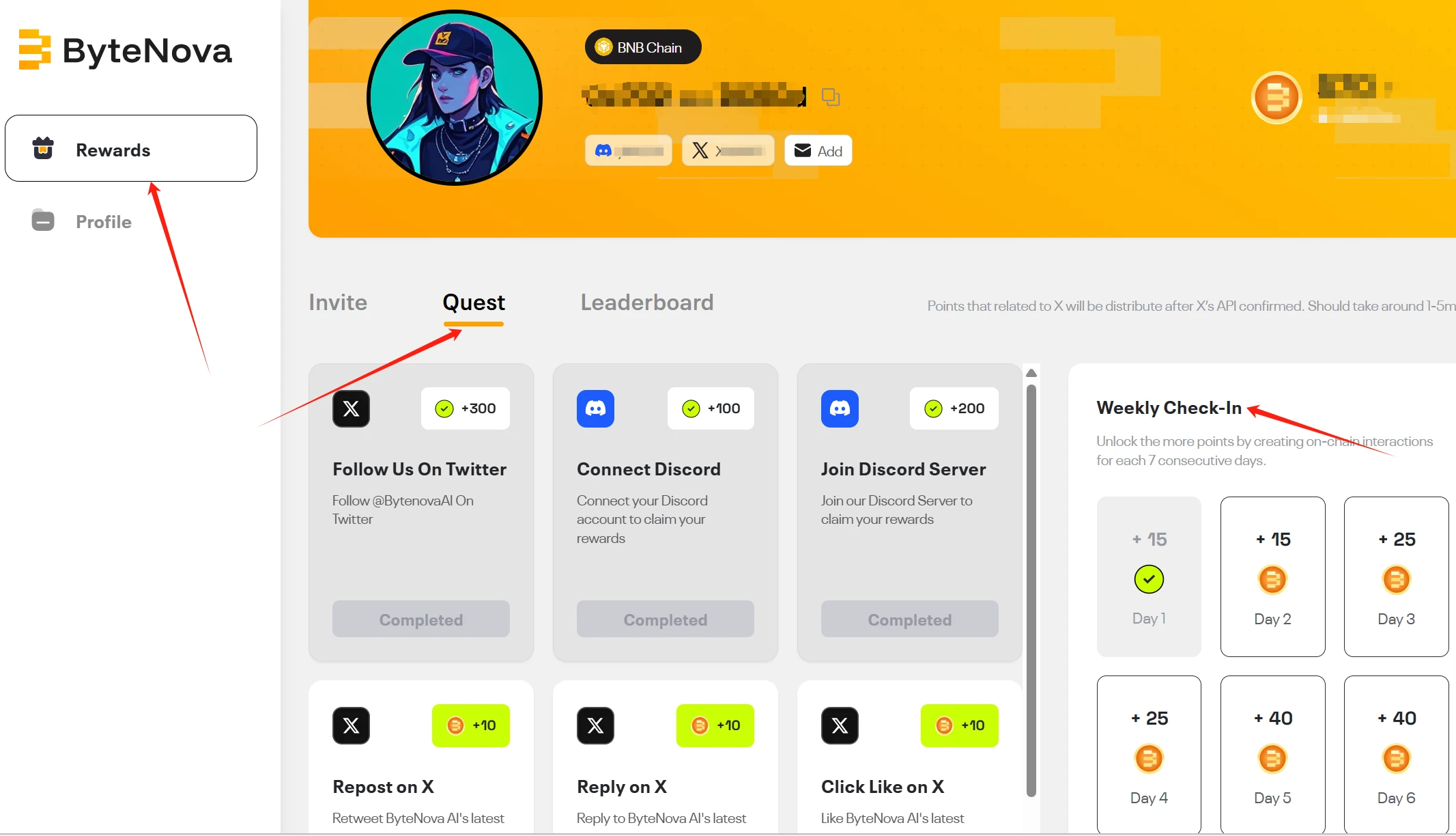 进入页面之后,可编辑“Profile”,选择头像,以及连接 Discord 和推特账号,这都是社交媒体任务的一部分。点击“Quest”就是任务列表,点赞、回复等互动任务只需点击链接进入即可,不需要真的执行。