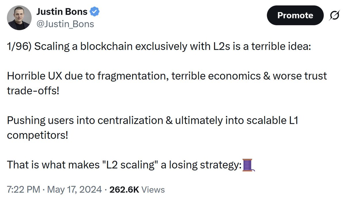 然而,这种方法在实践中几乎从未成功过。将交易流量推送到另一个竞争链并不能真正扩展原链的容量,反而为原链的实际使用提供了一个衰退的预兆,因为这种做法为"永远不必扩展L1"提供了某种程度的借口。