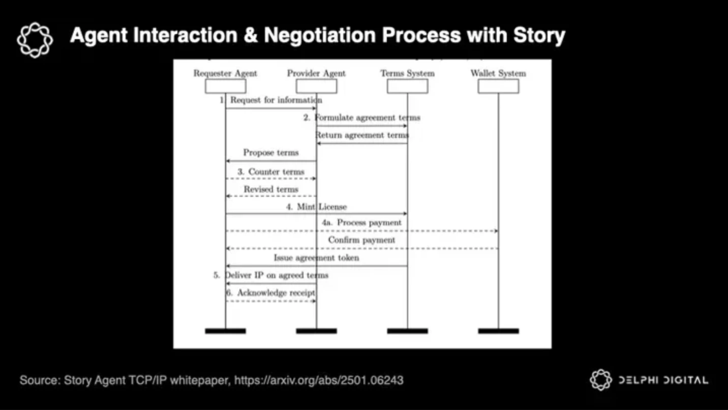 Story 推出的 Agent TCP/IP 旨在为智能体提供一整套自治工具,使其能够自行协商授权条款、执行复杂交易并履行协议,几乎无需人类实时干预。智能体之间的交互通过结构化的多轮协商实现,并由智能合约进行管理。标准化交互结构使得智能体可以反复提出条款、进行还价、修改细节,并在过程中持续铸造授权草案,确保整个协商过程具有清晰的链上记录和可溯性。