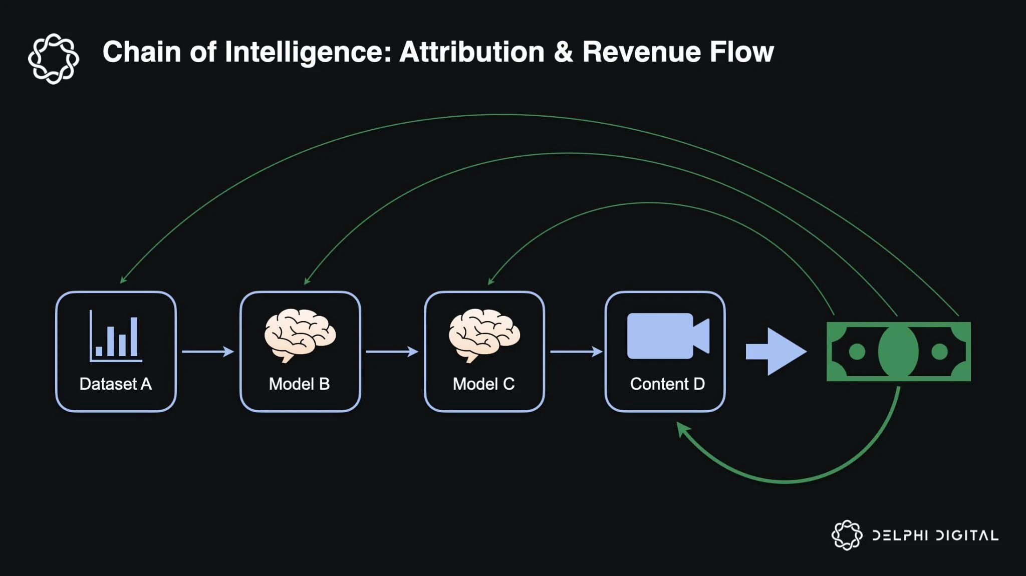 示例:数据集 A 被用于训练模型 B,模型 B 微调为模型 C,模型 C 生成内容 D。当内容 D 产生收入时,协议将根据预设的可编程授权条款,把收益分别分配给数据集 A、模型 B 和模型 C 的贡献者。