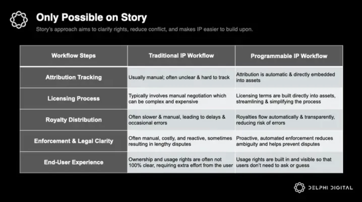 考虑到这一点,下方表格列出了 Story 的专用预言机框架与通用解决方案在关键 IP 流程中的差异。