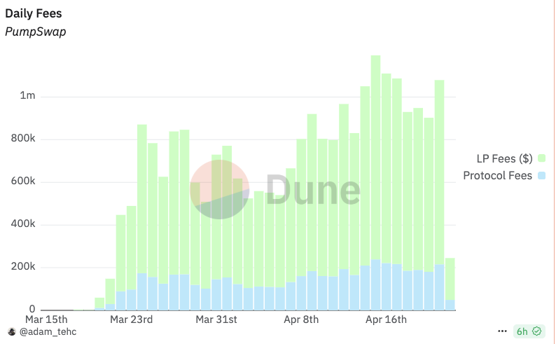上线后的第一个月左右,Pumpswap 就产生了约 2500 万美元的总费用(每天 10 万至 24 万美元),其中 LP 获得约 2000 万美元,其余 500 万美元分配给协议。